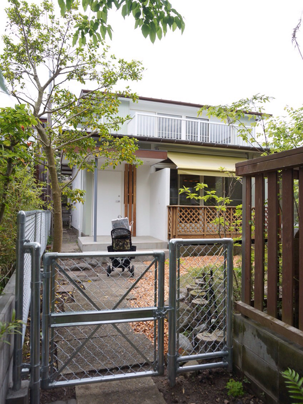 玄関周辺は清潔感のある白で塗られ、明るくなりました~!ドアの横の木部もいい感じ。ウッドデッキ上の黄色いオーニングもポイントになっています。
