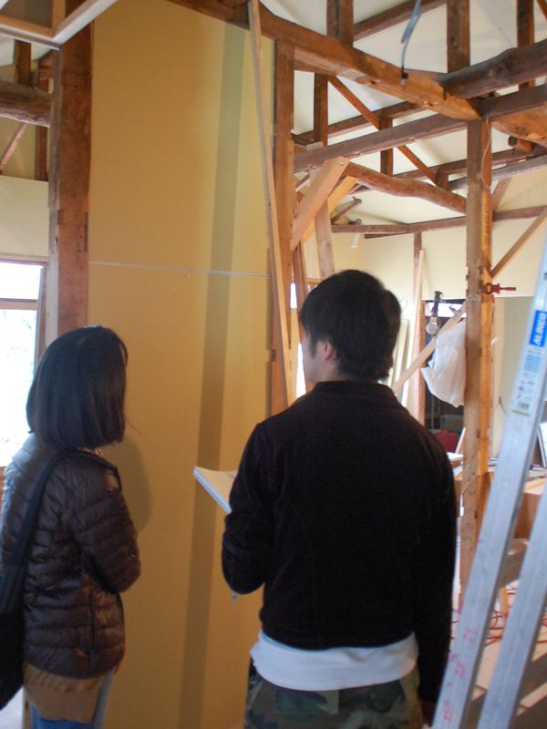 「これは『真壁』と言う壁の作り方です。昔の日本家屋などに多く見られるやり方ですね。柱の真ん中に壁が来るように施工するんです。K邸では、既存の古い柱の味わい深い表情を見せるために、このようにしたんですよ」と弊社設計士。