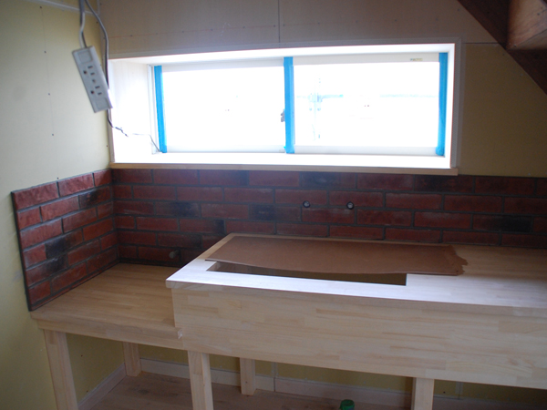 こちらはその1階にあるキッチン部分。コンパクトなサイズで造作しました。壁には息子さんのご要望でレンガをアクセントに。