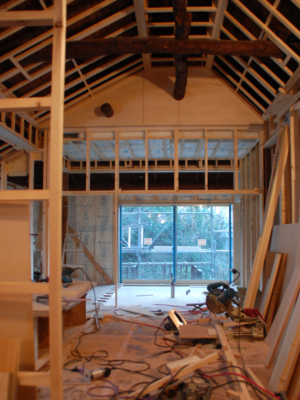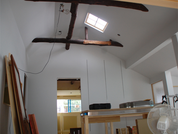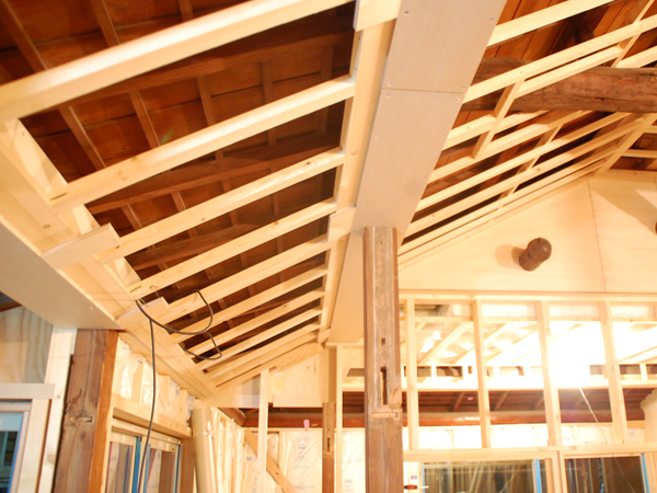 そこで、この梁を見せながら天井を仕上げるために、元の天井のもっと上の方に新たな天井を張ることにしたのです。ちょっと台形のような形に組まれているのが、新しい天井の垂木。ここに板を張るわけです。変形の勾配天井といったところでしょうか。
