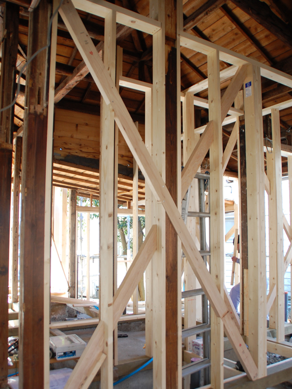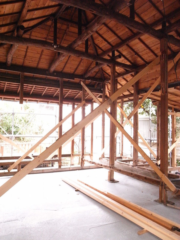 写真の向かって右の柱にご注目!古い柱に新しい木材を添え木するようにして、補強しているのが分かります。そこへさらに斜めに筋交いを入れて強度を高めています。