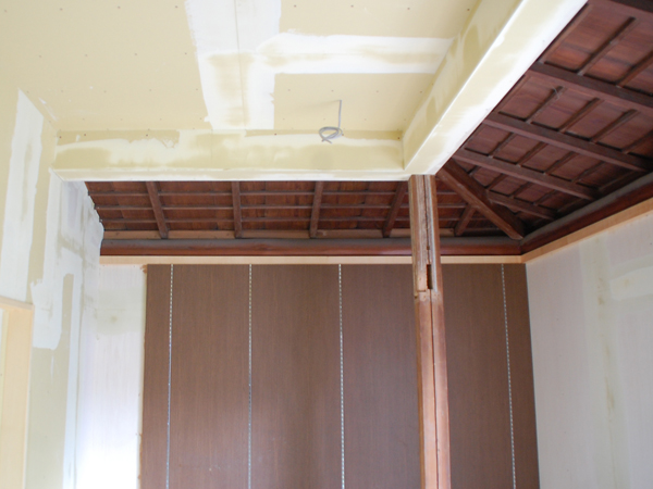 1階の天井は、天井板を張らない「あらわし」という手法で、天井高も以前より高くなりました。この古い板が見えている感じがノスタルジックでいいですね~。床にはサクラの木のフローリングを張りました。そして、この部屋を含む室内の壁はすべて息子さん夫婦自ら塗装する予定です。