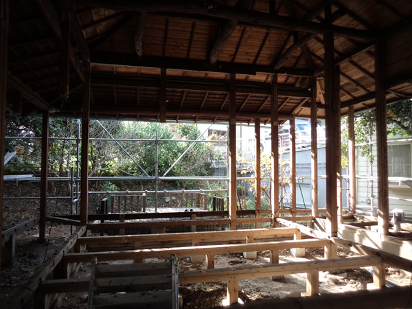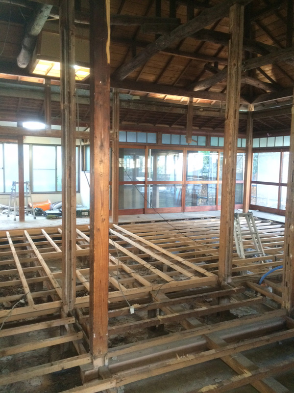 家の中では、柱や梁、大引といった、建物を支える骨格の部分の補修・補強工事の真っ最中!