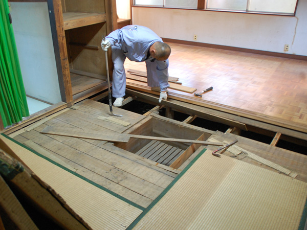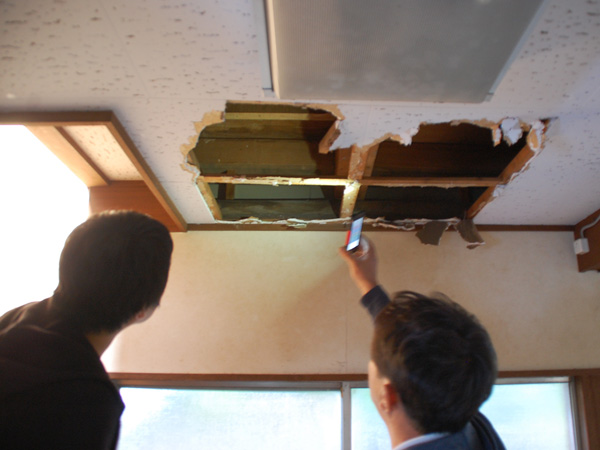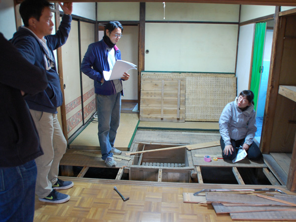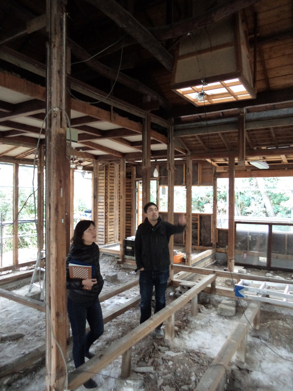 さて、引き渡しが済み、物件が正式にOさんご一家のものとなった後、中古住宅調査の専門家 小柳理恵さんと、実際に施工する工務店の代表 本田さんは、リノベーションのための本格調査を行いました。