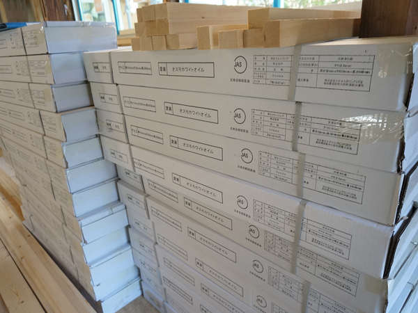 うず高く積まれたこちらは、お父さんお母さんが住む部分の床材です。ホワイトのオイルステインで予め塗ってあるアッシュの材。一番時を過ごすであろうダイニングルームを中心に張る予定です。