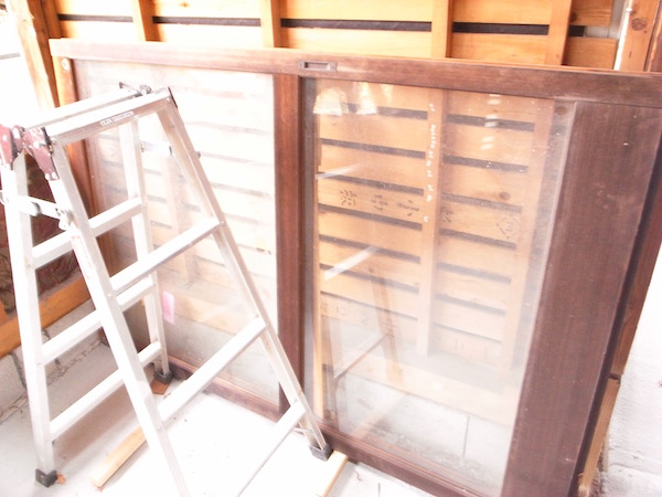 家の外には、出番を待つ新しいサッシたち。建て具を入れる箇所の補修が済んでから取り付けるのです。