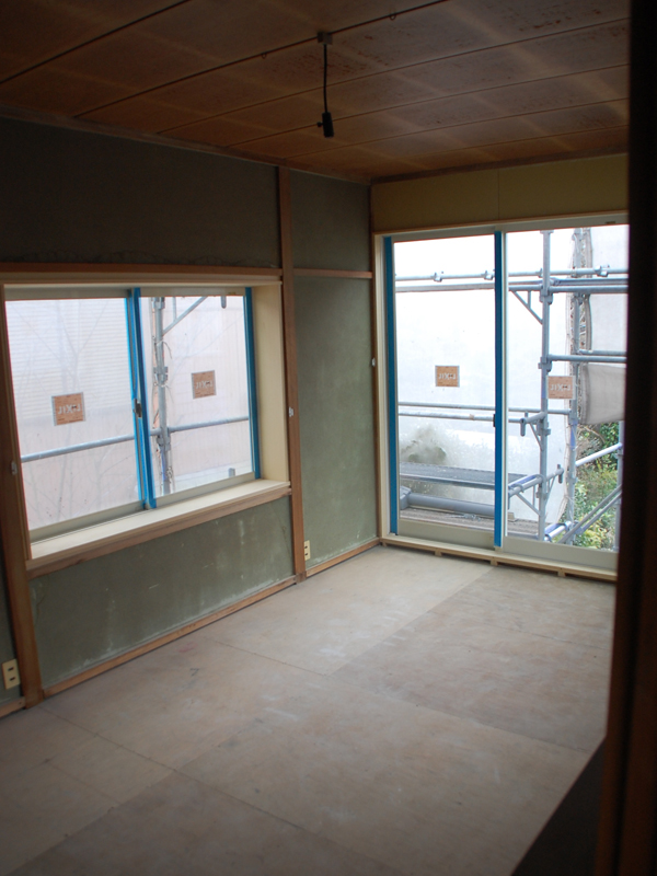 サッシこそ断熱性の高いものに取り替えましたが、モスグリーンの土壁も、天井板も、実は元のまま。ここに新しい畳を入れて、このまま使いたいとのご要望です。新しい物件にはないこの味が気に入っているんですね。