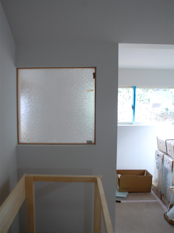 もともとあった模様ガラスの内窓もそのまま生かしました。このような光を透過する内窓があると、空間の広がりが違います。試しに写真のこの内窓を手で覆ってみると、体感が変わるのが分かりますよ!