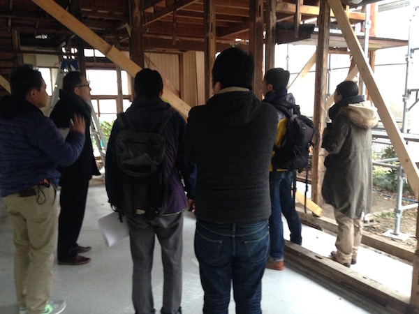 先日、中古住宅調査&構造補強の専門家である小柳理恵さんと、今回現場の施工に当たっている工務店ワイズホームの本田さんによって、念入りに躯体の調査が行われ、補強プランが作られました。それに基づいての工事です。