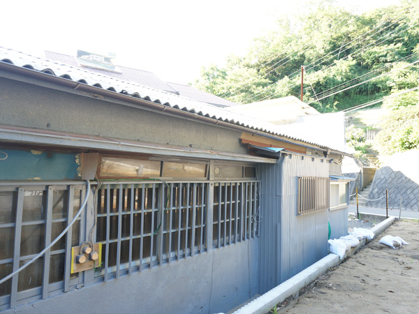 正面はガレージのようなシャッターがあり、奥に長ーく伸びた平屋建て、背後はワイルドな山。