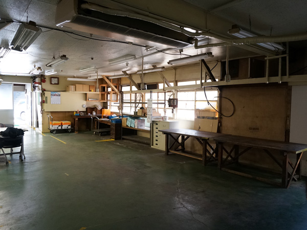 床はコンクリート、天井には飾り気のない蛍光灯と電気をとるためのレーンが吊り下がり、台車や作業机などが、ここが工場であったことを物語っています。
