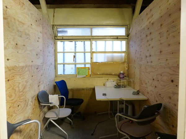 工場だった建物内には、真ん中に通路、両側にベニヤ板で仕切られた16のブースが並びます。