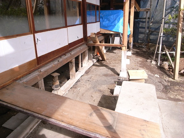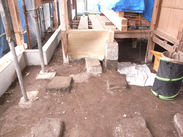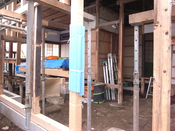 改めてコンクリートで基礎が打ち直され、その上に新しい柱で躯体の補強がなされています。