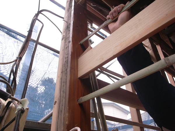 柱に空いた穴に、先端を合わせて竹をセットします。この柱は一部古いまま残しているため、建築当時に開けられていた竹小舞用の丸穴が、そのまま生かせるんですね。