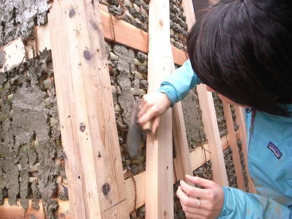 壁塗りももちろんワークショップ形式。竹小舞の隙間に押し込んだ土団子を、オーナー自らコテでのばします。水加減や練り加減で土の固さが違い、意外と力も要るし思った以上に難しい!