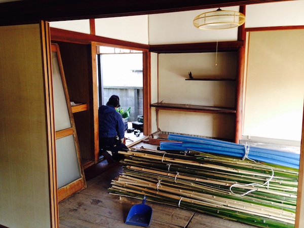 花曇りの朝、シェアハウスに集合したのは日本家屋再生を数多く手がける建築家の日高氏、オーナーのKさん、そしてご縁のある友人知人やそのご家族。今日は「竹小舞(たけこまい)」といって、壁の芯となる部分をスライスした竹を編んで作って行く工程です。