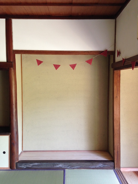 日本家屋らしく床の間もきれいに整いました。今は可愛らしいガーランドがかかっていますが、そのうち書でも掛けようかなとオーナー。