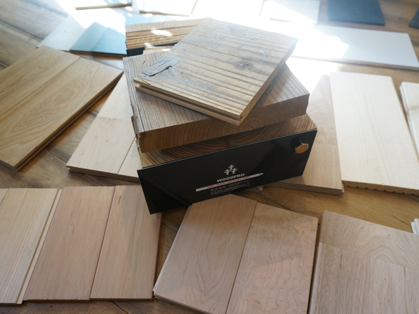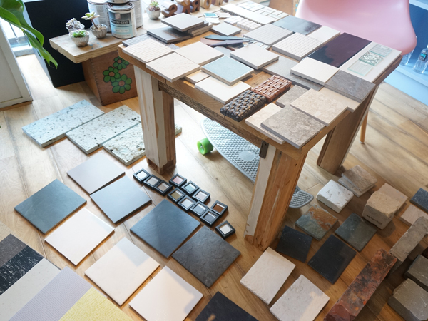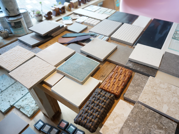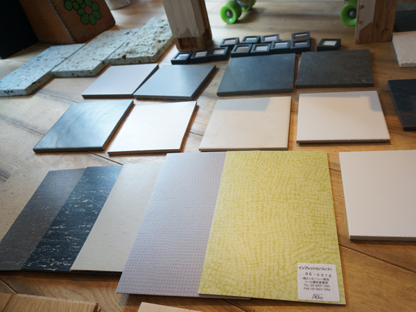 設計士が各社から取り寄せた床材、タイル、フローリングを並べて