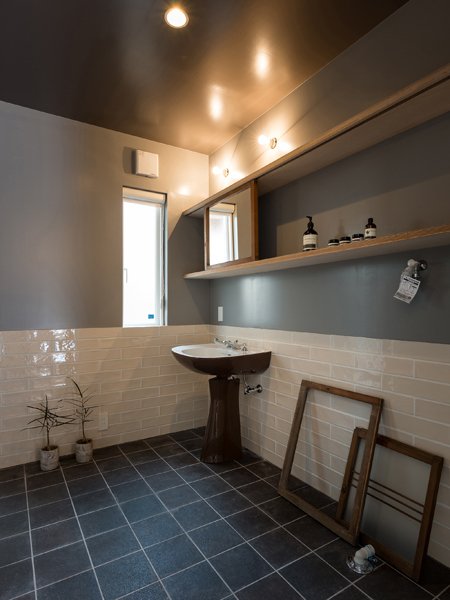 TOTOのアンティーク洗面台が主役のパウダールーム。ほんの少しグレイッシュなトーンを混ぜた壁の色と、床のタイルの濃いグレイが空間を引き締めています。戸棚に取り付けた鏡は古い建具を利用したもの。
