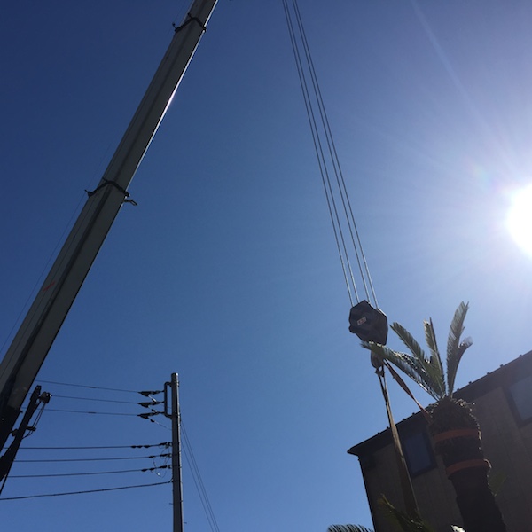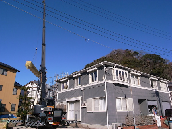 快晴の冬の空に、高く高く材木が吊り上げられ、建て方の開始です。