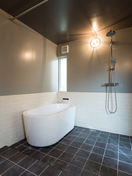 洗面台の反対側にはバスタブ。外から直接出入りできるドアが付いており、海遊びからそのまま直行できます。