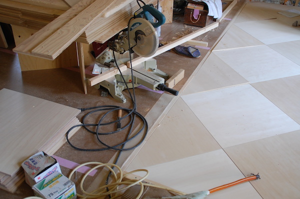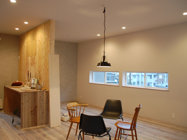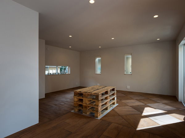 1階の床はシナベニヤをパッチワークのようにいろいろな貼り方で貼り、オイルステインで仕上げました。間仕切りがない空間にも表情が生まれます。もちろん間仕切りは好きな位置に後から設置可能。
