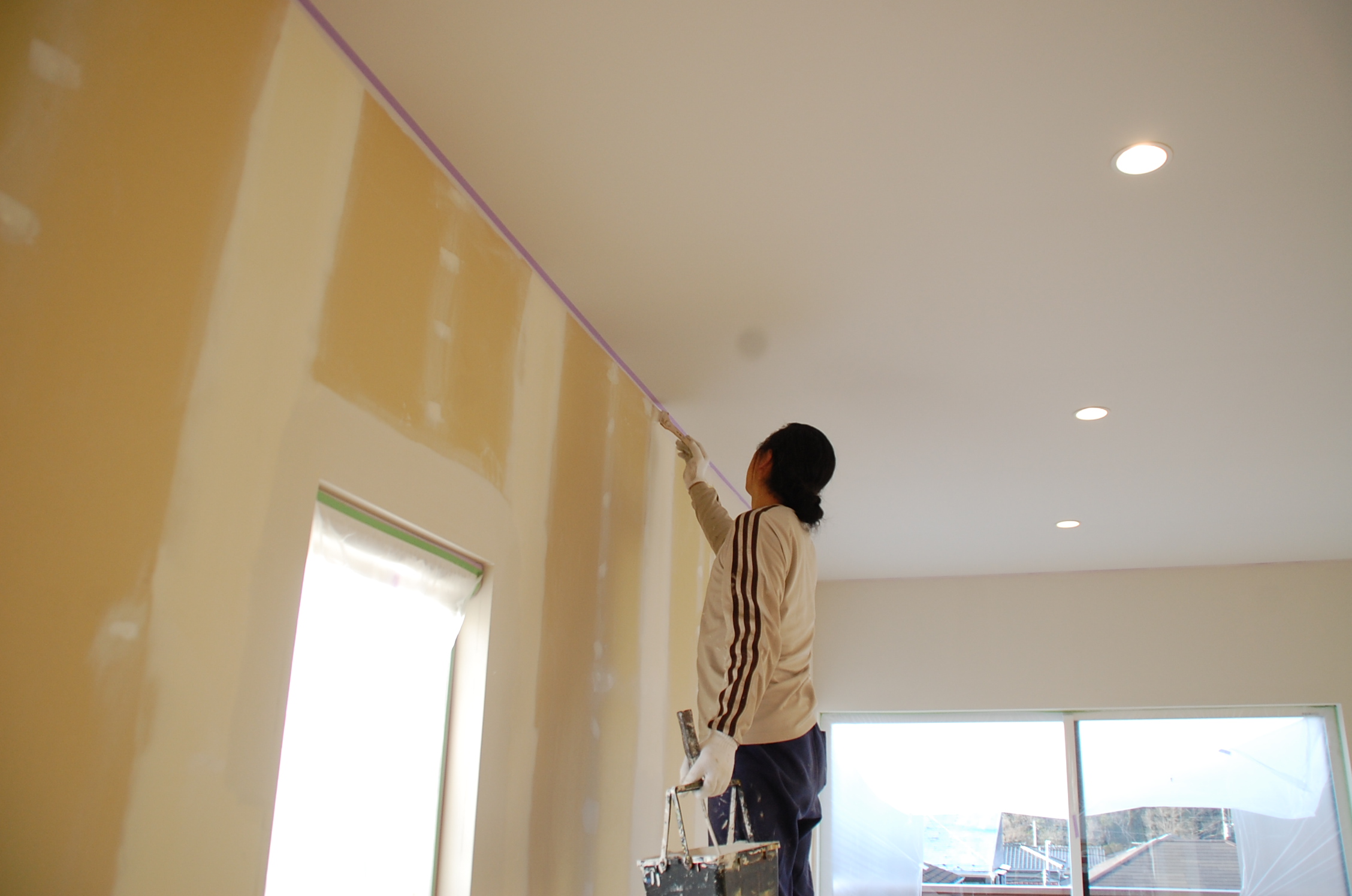 室内では、こないだパテ埋めの済んだ壁に、いよいよ塗装が入りました。