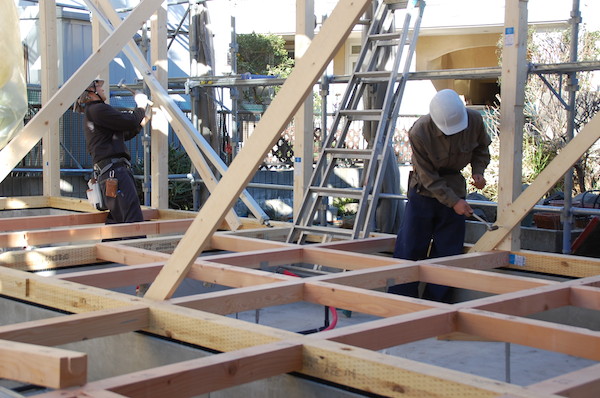 いちいち誰かが指示を出さなくても、阿吽の呼吸でスイスイと正確に進んで行く作業に、日本の大工の凄さを見る思い。