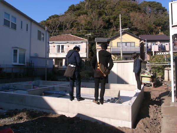 基礎の縁に立ち、これからここに立つスケルトンハウスについて話し合う弊社の設計士たち。
