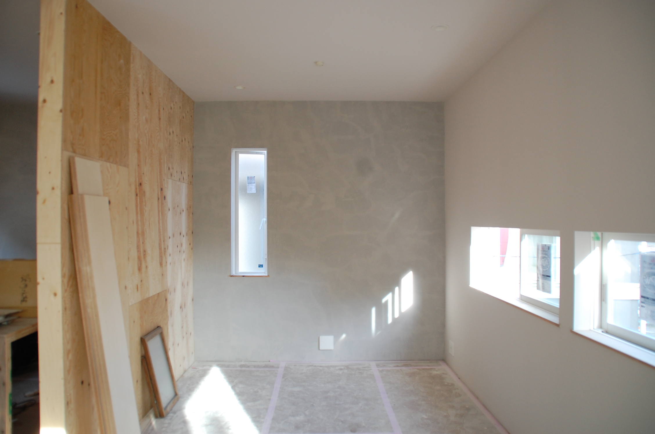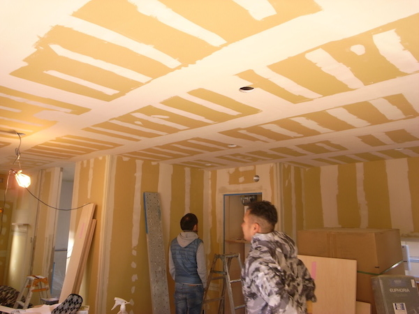 今回は壁を塗装で仕上げるので、凹凸のないように、壁や天井を職人さんが丁寧にパテ埋めしていきます。