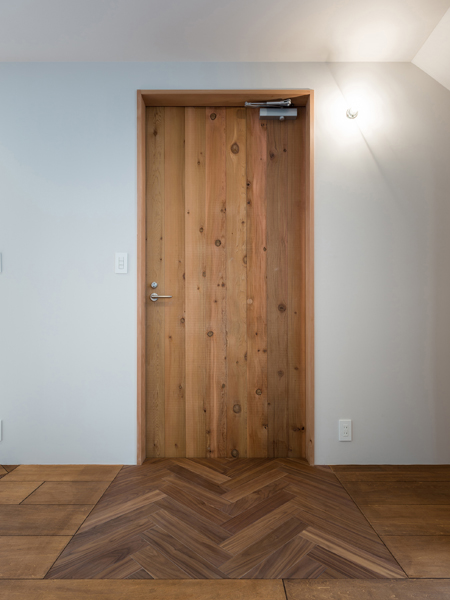 玄関ドアの内部はウォルナットをヘリンボーンに貼った、たたき。