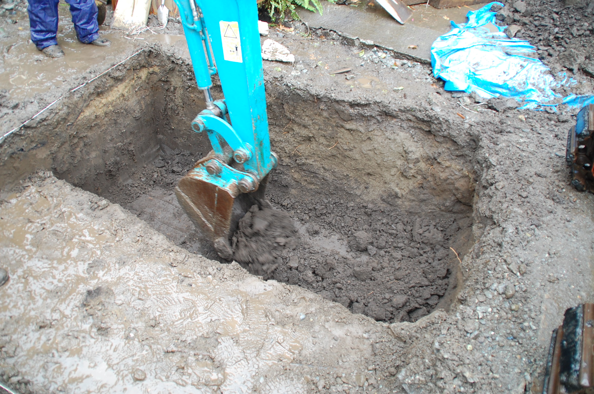 「試掘」というのは、この土地に歴史的に重要な埋蔵物がないかどうか確かめるために敷地の一部をサンプルとして掘ってみる、というもので、役場関係のスタッフの方が来て行います。
