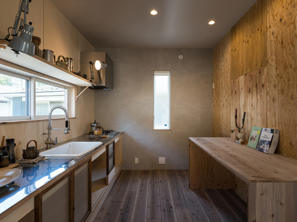 キッチンからは山の景色が見えます。足元の収納は、隠したい部分だけ隠せるセミクローズのタイプ。古い建具とガラスを利用しています。キッチン背面の作業台には床板と同じ足場板を。間仕切り壁には木の模様を楽しめるラーチ合板でそのまま仕上げ、DIYで棚やフックなどを自由に付けられるようにしました。