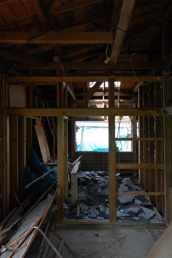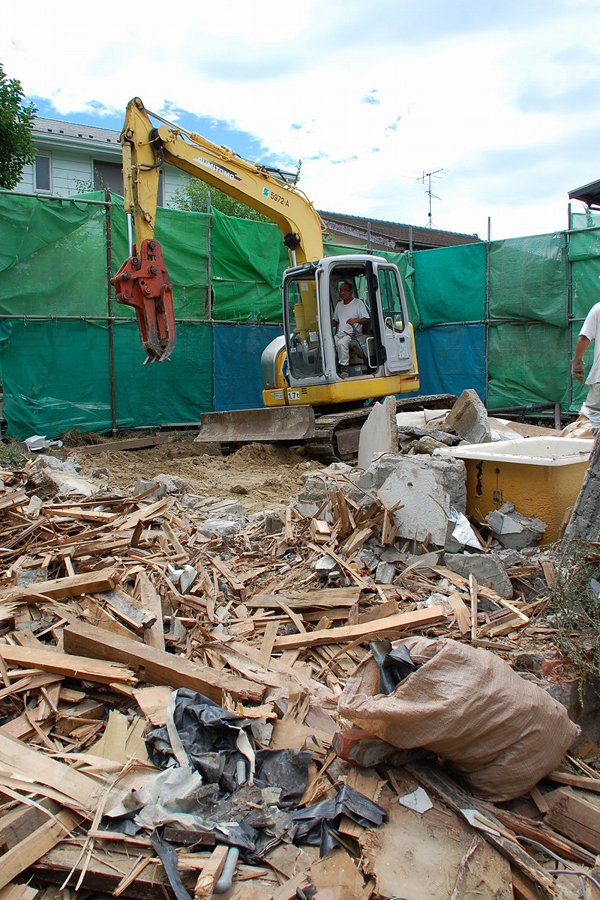 解体工事終盤の様子です。先日まではカタチのあった既存家屋は、ほぼ面影なし。