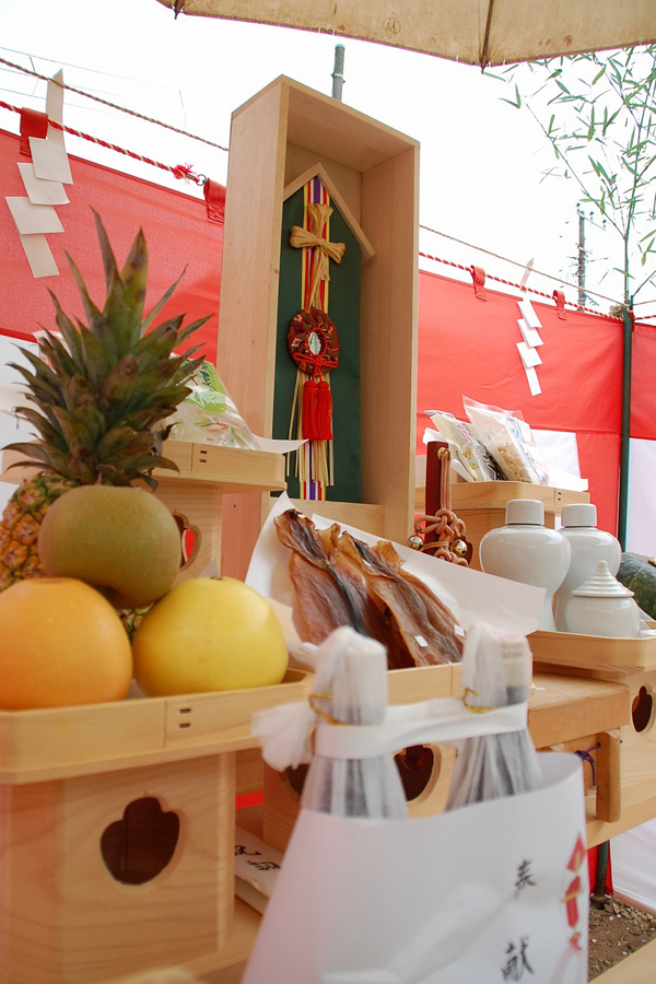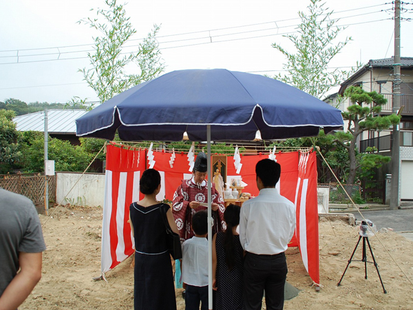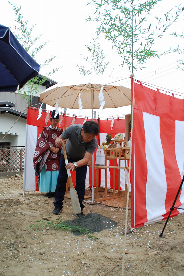 こちら「地鎮の儀」の様子。鎌入れ、鋤(スキ)入れのあとの鍬(クワ)入れをやっています。