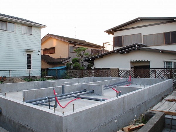 この時点で基礎内部を通る配管も設置済みです。次は、いよいよ上棟を待つばかり!
