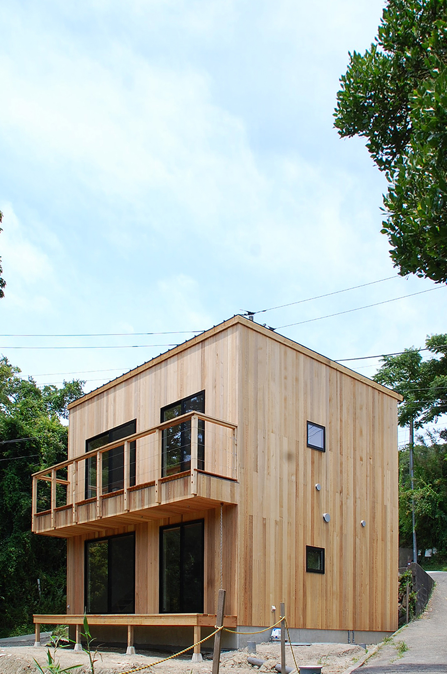 シンプルなBOX型にレッドシダーの外壁。葉山の濃い緑の風景に映えますね。