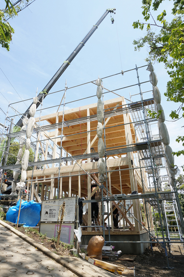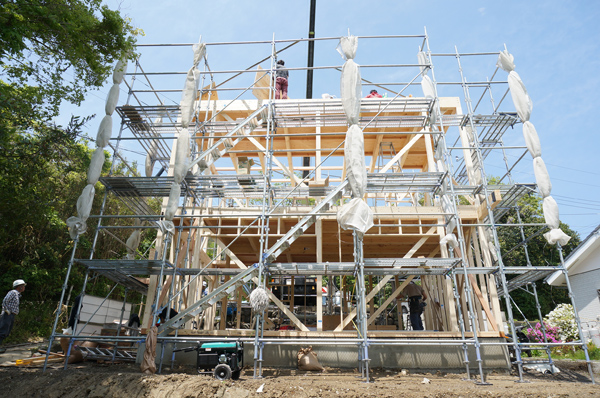 つまり、家の骨組みを組み立てる工事。職人さんたちが息を合わせる姿、
