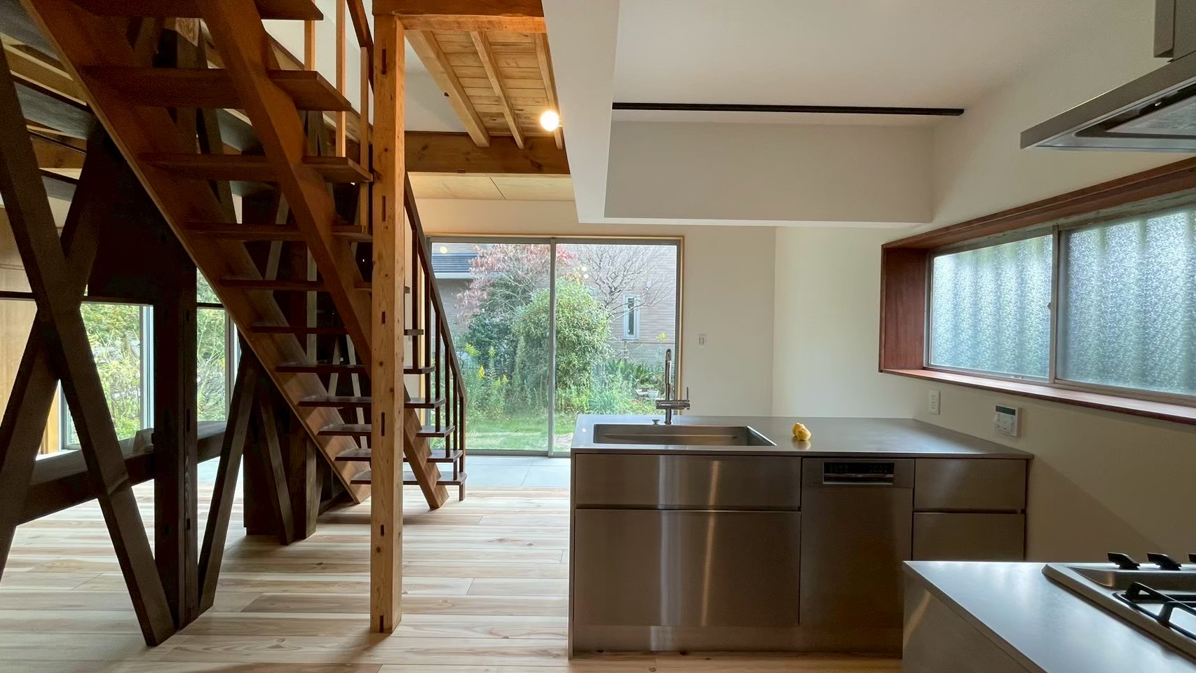 そこで、リビングとダイニングは庭に大きく開く位置に計画。シンクは庭に向かって配置されました。