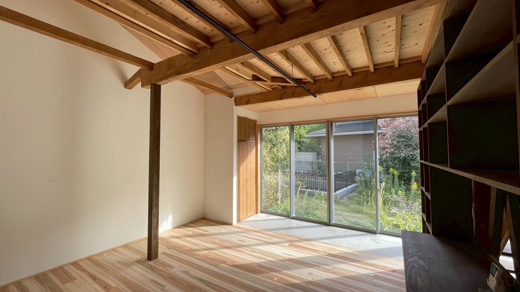 筋交い(斜めの木材)を入れて構造にも配慮し、開放感がある居心地の良い空間です。
